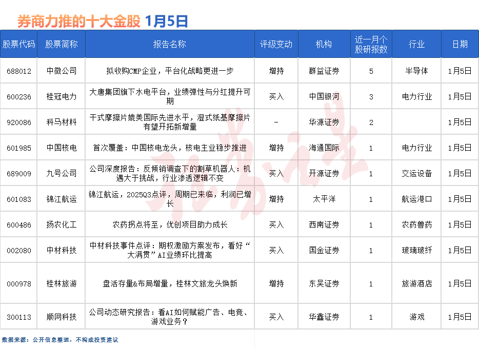 中微公司最受券商关注,近一个月获爱建证券、东吴证券、中邮证券等5份券商研报关注,位居1月5日券商力推股榜首。