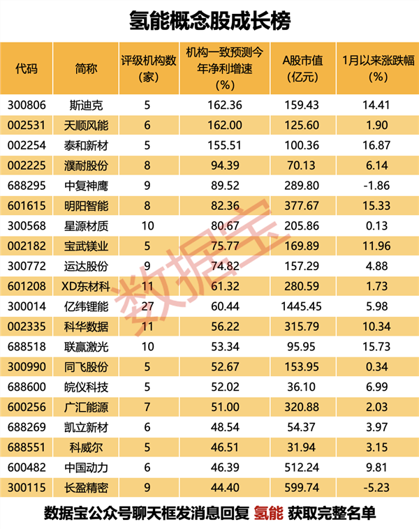 据证券时报·数据宝统计,A股市场上,氢能概念股合计有370多只。其中,阳光电源、长城汽车、宝丰能源、长安汽车等均有30家以上机构评级,银轮股份、亿纬锂能、卫星化学、紫金矿业等均有10家以上机构评级。