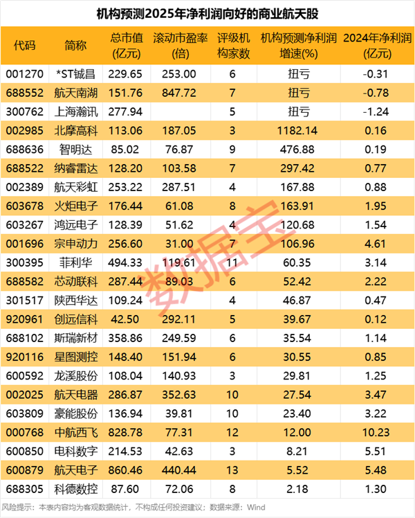 根据3家及以上机构一致预测,23只商业航天股净利润将同比改善。机构预测北摩高科、智明达、纳睿雷达、航天彩虹、火炬电子、鸿远电子、宗申动力2025年净利润有望实现翻倍,菲利华、芯动联科等净利润增速有望超过50%。