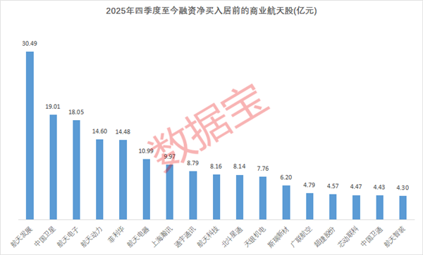 证券时报·数据宝梳理了2025年四季度以来(截至2026年1月7日),融资资金净买入居前的商业航天股,金额在4亿元以上的个股共17只。