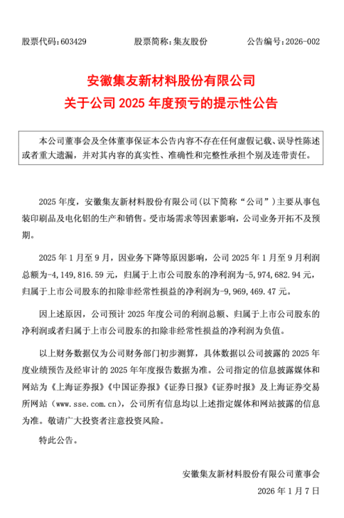 1月7日,集友股份(603429.SH)公告显示,受市场需求等因素影响,业务开拓不及预期,公司预计全年利润总额、归属于上市公司股东的净利润及扣除非经常性损益的净利润均为负值,正式宣告公司年度业绩陷入亏损境地。