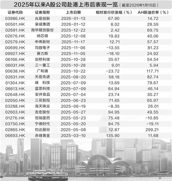 豪威集团、兆易创新则分别于今年1月12日、13日登陆港交所,完成了“A+H”双资本平台的布局。其中兆易创新上市以来股价走好,目前股价较发行价大涨67.90%。此外,2025年四季度以来实现港股上市的还有三一重工、南华期货股份、纳芯微、赛力斯等明星公司。