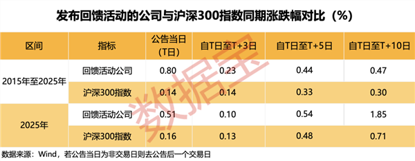2015年至2025年公告当日(T日,若当日为非交易日则取公告后一个交易日)、自公告日至T+3日、T+5日、T+10日,相关公司平均涨幅分别为0.8%、0.23%、0.44%、0.47%,同期沪深300指数平均涨幅均未超过0.4%。
