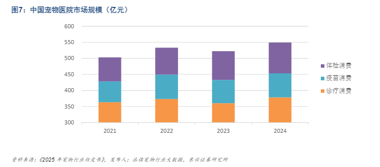 宠物医疗已成为规模庞大且高速增长的刚性市场。 根据行业白皮书数据,截至2024年,我国宠物医院市场规模已达549亿元。在养宠数量持续增加、宠物老龄化加剧以及消费观念“拟人化”三大核心驱动下,该市场远未见顶。若以完备的医疗覆盖计算,潜在市场规模可超1800亿元。预计到2030年,随着渗透率提升,市场规模有望突破千亿,年复合增长率保持在10%以上,其成长确定性与韧性使其成为宠物赛道中值得深耕的“长坡厚雪”。