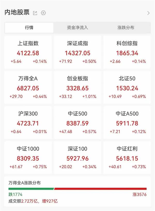 今日(1月22日),沪指全天窄幅震荡,收涨0.14%,最新报4122.58点。深证成指上涨0.5%,创业板指上涨1.01%。今日市场成交27164.05亿元,较昨日放量927.61亿元。
