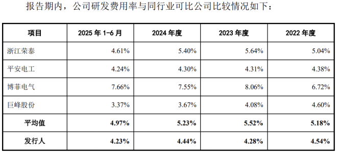 对比同行来看,固德电材的研发费用率低于行业均值。2022年、2023年、2024年及2025年上半年(以下简称报告期内),公司研发费用占各期营业收入的比例在4.4%左右,低于同期行业均值约5.2%的水平。