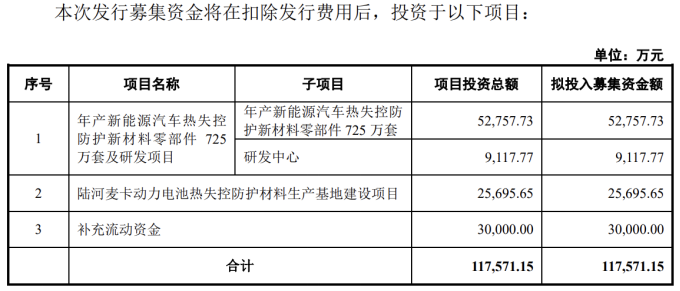 其中,项目一是公司现有核心业务的扩建项目,旨在提升公司新能源汽车动力电池热失控防护零部件产能。招股说明书显示,该项目规划建设年产580万套动力电池热失控防护零部件和145万套模切产品。