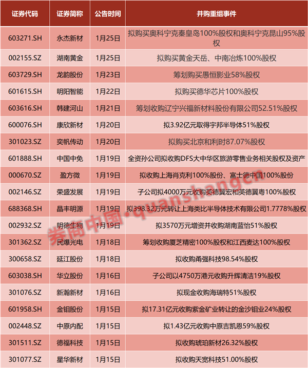 近期,A股并购重组市场持续活跃。据券商中国记者不完全统计,1月15日以来,包括湖南黄金、永杰新材、龙韵股份、明阳智能等企业在内,已有近20家A股上市公司披露了并购重组进展最新公告。有研究机构指出,在政策的支持下,A股市场并购重组案例或将持续增多,促进产业资源整合,加快新质生产力发展,科技类企业、各领域产业龙头等或为重点方向。