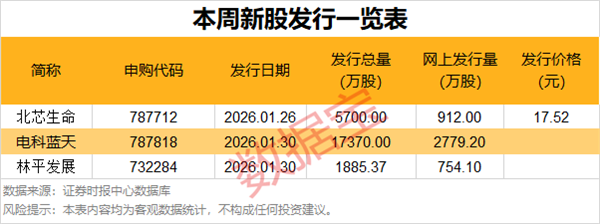 根据发行安排,本周暂有3只新股申购,本周一(1月26日)可申购北芯生命,本周五可申购林平发展、电科蓝天。