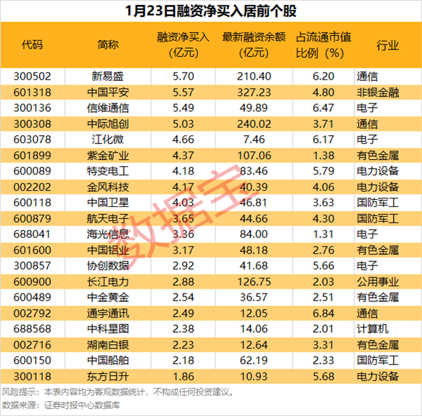 具体到个股,1月23日共有1460只股获融资净买入,净买入金额在1亿元以上的有49只,其中4只融资净买入额超5亿元。新易盛融资净买入额居首,当日净买入5.70亿元,其次是中国平安、信维通信、中际旭创,融资净买入金额分别为5.57亿元、5.49亿元、5.03亿元。