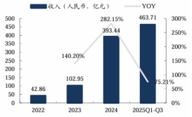 高效体验转化为亮眼业绩:2022-2024年营收从42.86亿元跃升至393.44亿元,三年复合增速达203%;2025年前三季度营收463.71亿元,同比增长75.2%,远超2024年全年水平。