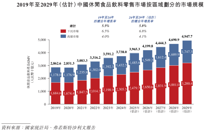 下沉市场是鸣鸣很忙的核心市场,而该市场仍有巨大挖掘空间。弗若斯特沙利文报告显示,中国休闲食品饮料2024年在下沉市场的GMV以达到2.3万亿元人民币,2019-2024年的复合增长率为6.5%,预计2024-2029年间,下沉市场GMV的年复合增长率保持在6.8%,领跑高线市场4.1%的预期复合年增长率。