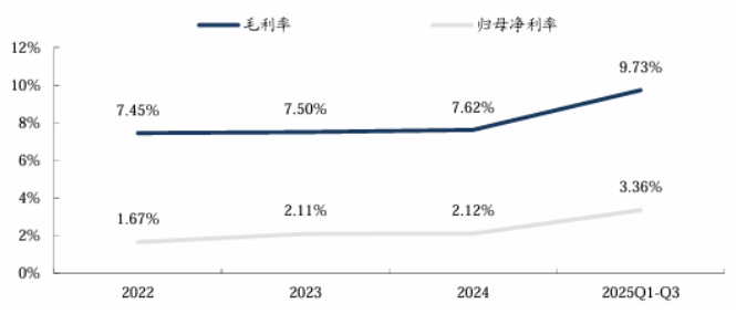 得益于供应链优化和规模效应,2022-2024年公司毛利率分别为7.45%、7.50%、7.62%,同期归母净利率分别为1.67%、2.11%和2.12%。