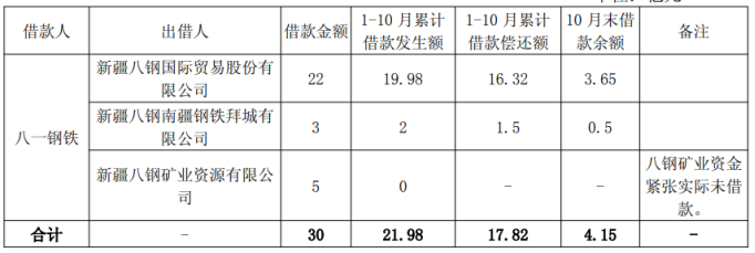 资金链紧绷下,八一钢铁只能依赖控股股东财务资助。根据《关于2025年度借款关联交易预算的议案》,八一钢铁2025年向控股股东新疆八一钢铁集团有限公司(下称“八钢集团”)累计借款额度最高为30亿元。当年1-10月累计借款21.98亿元,累计借款偿还额17.82亿元。