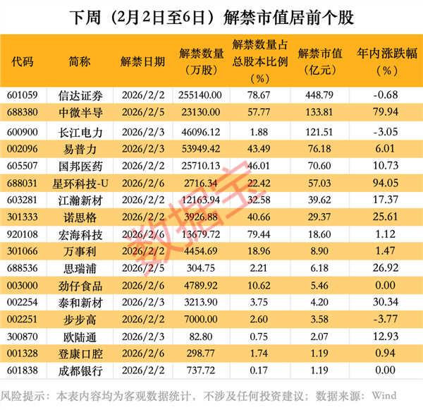 下周(2月2日至6日)将有42股解禁,总解禁市值为1034.19亿元。