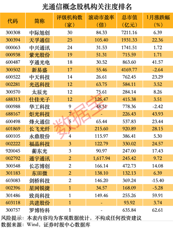 据数据宝统计,有20多只光通信概念股有机构评级。具体来看,中际旭创有30家机构评级居首。中原证券研报指出,公司表示硅光方案得到重点客户的认可与验证通过,800G和1.6T产品中硅光比例有望持续提升。