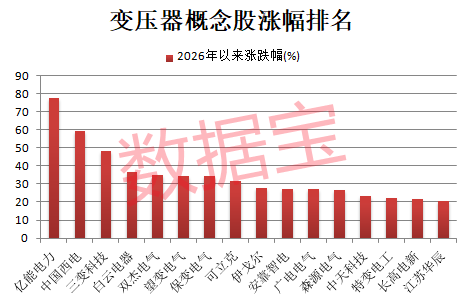 二级市场上,变压器概念股近期走势活跃。据证券时报·数据宝统计,截至1月30日收盘,变压器概念股今年以来平均上涨14.62%,大幅跑赢同期上证指数。亿能电力、中国西电、三变科技、白云电器、双杰电气等涨幅靠前,其中亿能电力累计涨幅77.7%,排在第一位。