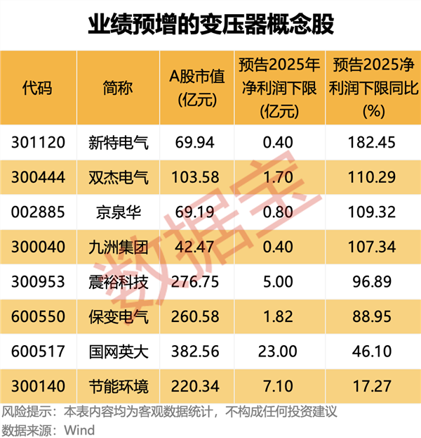 从已披露的业绩预告数据来看,按照业绩预告净利润下限计算(若无下限则取公告数值),8只变压器概念股2025年净利润有望同比增长(含扭亏为盈),包括新特电气、双杰电气、京泉华、九洲集团、震裕科技等。