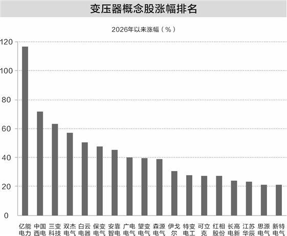 二级市场上,变压器概念股近期走势活跃。据证券时报·数据宝统计,截至2月2日收盘,变压器概念股今年以来平均上涨19.02%,大幅跑赢同期上证指数。亿能电力、中国西电、三变科技、双杰电气、白云电器等涨幅靠前,其中亿能电力累计涨幅116.73%,排在第一位。