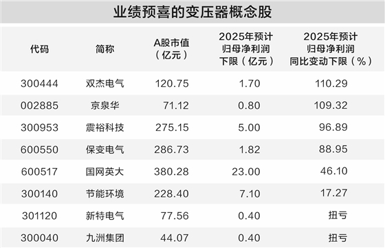 从已披露的2025年业绩预告数据来看,按照业绩预告归母净利润下限计算(若无下限则取公告数值),8只变压器概念股2025年业绩预喜(含扭亏为盈),包括双杰电气、京泉华、九洲集团、震裕科技等。