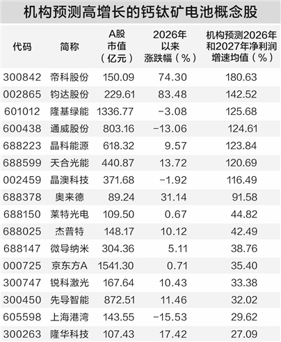根据5家以上机构一致预测,2026年、2027年净利润增速均有望超20%的钙钛矿电池概念股有16只。截至2月2日收盘,今年以来这16只概念股平均上涨14.66%,其中钧达股份、帝科股份、奥来德累计涨幅均超30%。