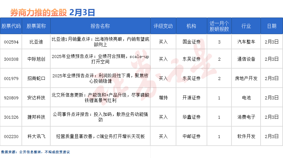 比亚迪最受券商关注,近一个月获东吴证券等3份券商研报关注,仅2月3日就有东吴证券和国金证券等两份券商研报关注,位居2月3日券商力推股榜首。
