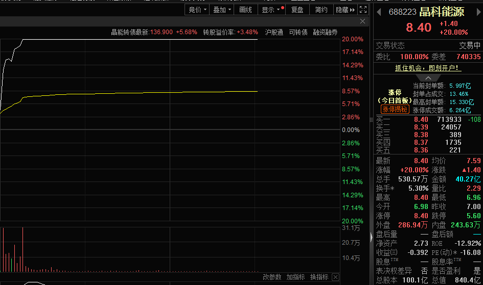 2月4日午后太空光伏概念再度拉升,晶科能源(688223)20cm涨停。