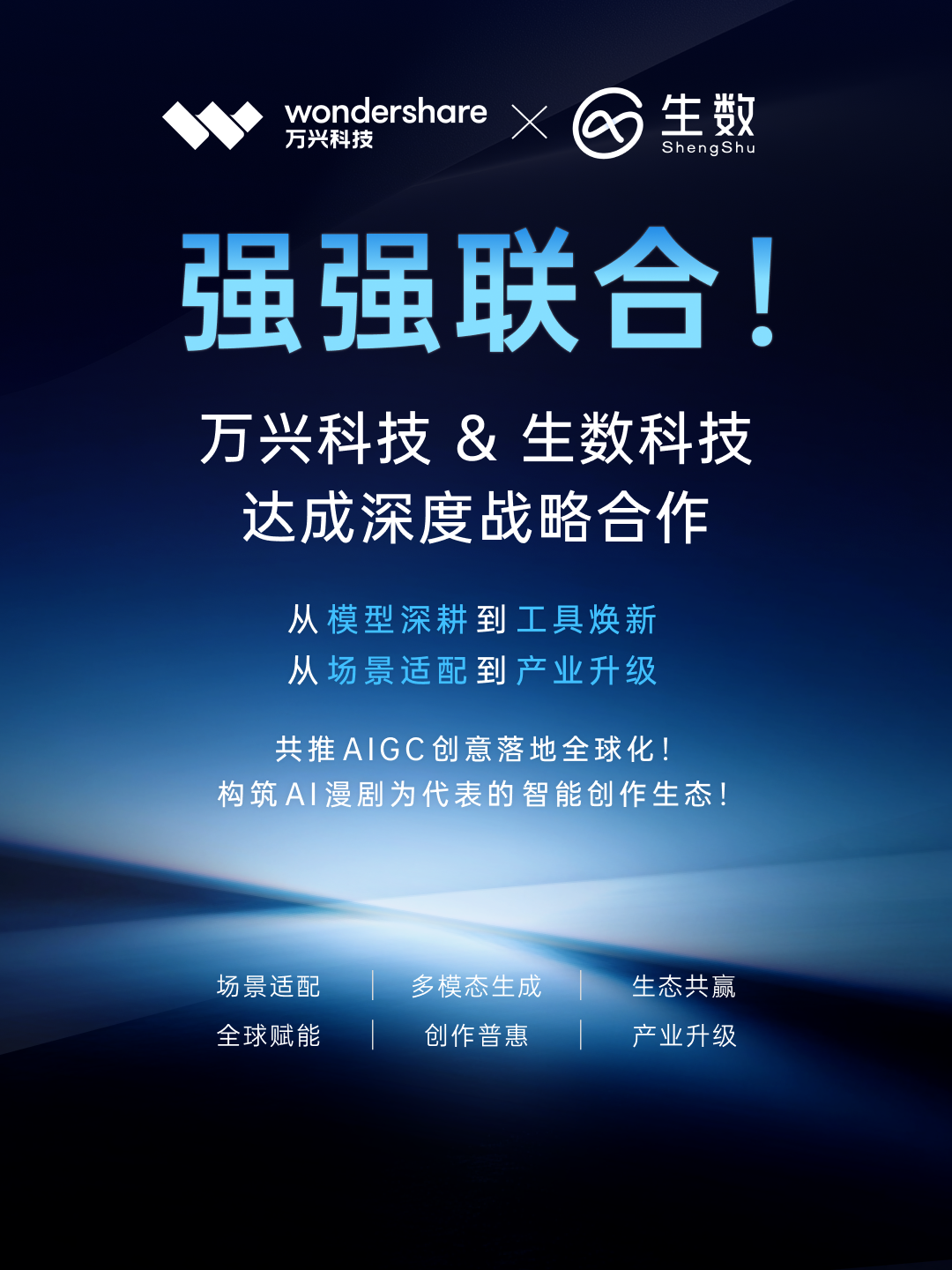 继推出万兴剧厂、千万级投资爆款漫剧制作厂商灵漫快创后,2月5日,AIGC软件A股上市公司万兴科技(300624.SZ)对外宣布加码其AI漫剧战略,斥资数千万元战略投资专注于多模态通用大模型研发的人工智能企业生数科技,同时双方正式达成战略合作,将进行“大模型+工具+场景”的生态级共创,打造AI漫剧工业化生产新范式。双方在深圳举办战略投资合作签约仪式,万兴科技董事长吴太兵、生数科技CEO骆怡航等双方核心高层共同出席和见证。