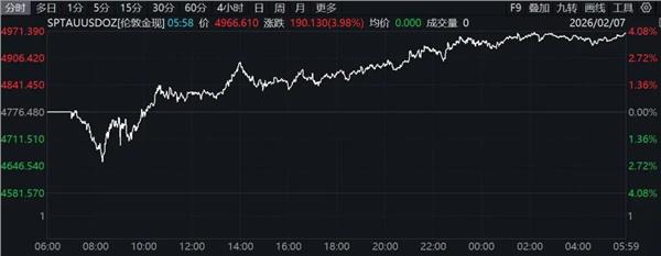 国际贵金属大涨,现货黄金涨近4%,现货白银涨逾9%。COMEX黄金期货收涨2.03%,报4988.6美元/盎司,本周累计上涨1.65%;COMEX白银期货收涨1.06%,报77.525美元/盎司,本周累计下跌9.06%。