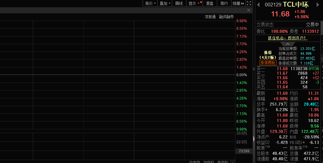 2月9日,光伏概念板块集体走强,个股方面,TCL中环(002129)股价涨停。