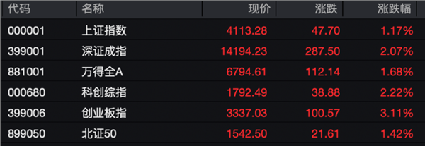 2月9日上午,A股市场整体上行,上证指数收复4100点整数关口,创业板指涨幅超过3%,超4400股飘红。截至午间收盘,上涨指数涨1.17%,报4113.28点;深证成指涨2.07%,科创综指涨2.22%,创业板指涨3.11%,北证50指数涨1.42%。