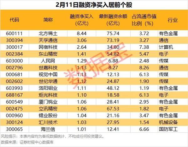 截至2月11日,市场融资余额合计2.63万亿元,较前一交易日减少159.17亿元。具体到个股,2月11日共有1312股获融资净买入,净买入金额在千万元以上的有295股,其中15股融资净买入额超1亿元。北方稀土融资净买入额居首,当日净买入8.44亿元;其次是天孚通信、网宿科技,融资净买入金额分别为3.06亿元、2.64亿元;融资净买入金额居前的还有东山精密、人民网、世嘉科技等。分行业统计,获融资客净买入超亿元个股中,有色金属、传媒、电子等行业较为集中,分别有4只、3只、3只个股上榜。