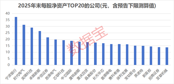 截至当前,披露2025年每股净资产(含年报、未披露年报或快报则根据预告下限测算:归属母公司所有者权益下限/2025年末总股本)的220余家公司中,34家公司2025年末每股净资产超过10元,5家公司超过20元。