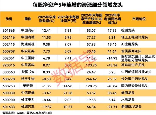 从市场表现来看,截至2026年2月13日,2025年以来涨幅居前的有中国汽研、中国海诚、海康威视,3家公司2025年净利润均有不同幅度增长。其中,中国海诚是轻工工程设计龙头,中国汽研是中国汽车检测领域龙头。对于海康威视,东方证券表示,公司自研观澜大模型,大幅拓展AI应用能力边界,作为AI应用龙头,创新业务有望继续成为重要增长点。