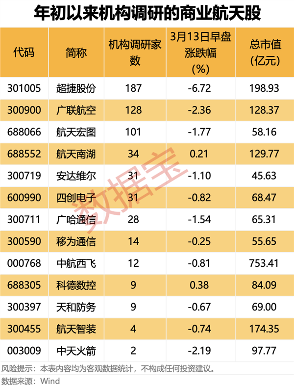 据证券时报·数据宝统计,A股商业航天概念股共有68只,13股年初以来获得机构调研,超捷股份、广联航空、航天宏图调研机构家数均超过100家,机构、投资者对商业航天关注度持续升温。