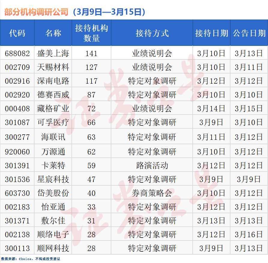 随着A股市场年报披露进入高峰期,机构投资者的调研热情持续升温。根据Choice数据统计,3月9日至3月15日这一周内,近130家上市公司接待了各类机构投资者的实地走访与交流。