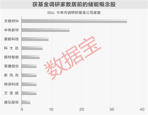 随着产业快速发展,储能概念股获得机构持续关注。统计显示,今年以来,有12只个股获基金公司调研,天赐材料、中伟新材、豪鹏科技的调研基金公司家数居前,分别为35家、16家、9家。