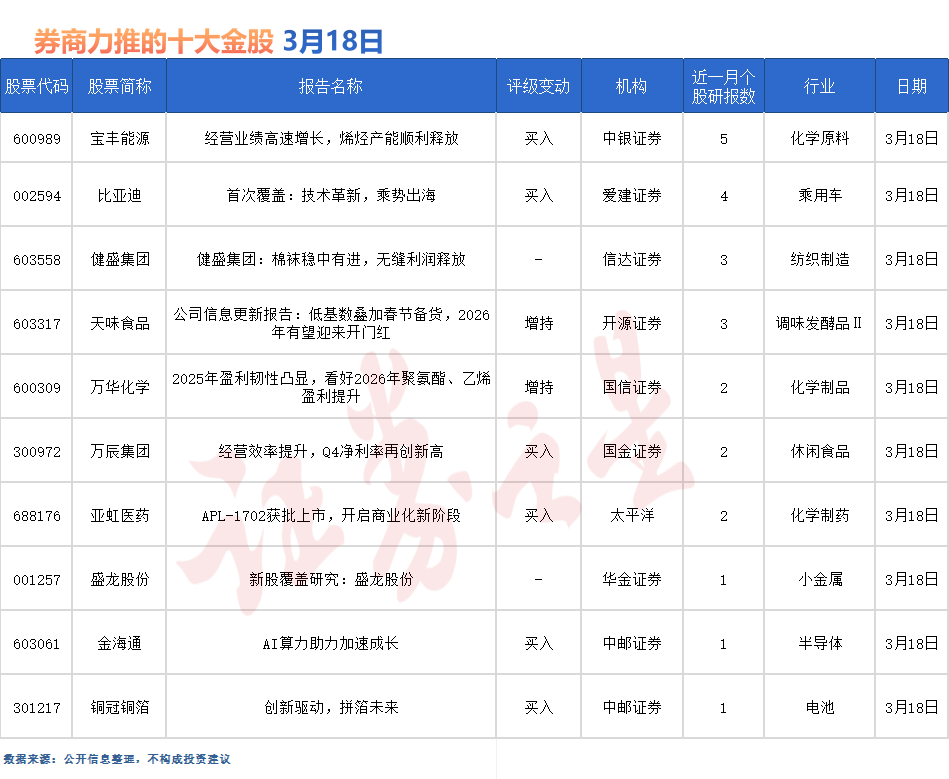 比亚迪也备受券商关注,近一个月获东吴证券、华金证券、开源证券等4份券商研报关注,位居3月18日券商力推股榜第二。