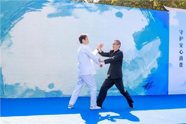 随后,咏春拳传人登台表演量身创编的“消保功夫操”,摊手揭骗局、膀手筑防线、耕手除乱象,刚劲有力的拳法搭配