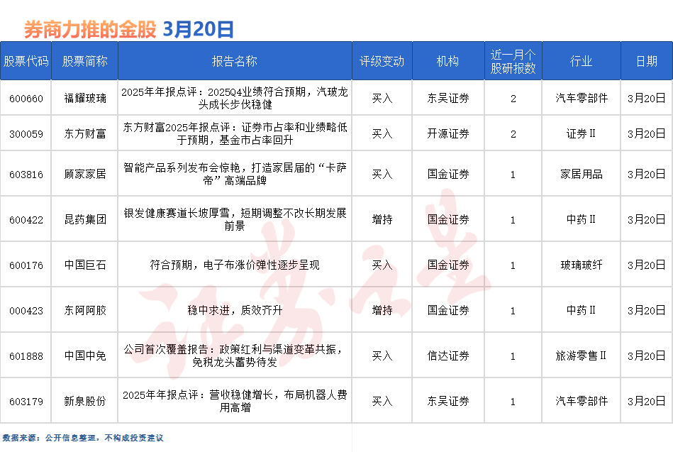 据证券之星数据库不完全统计,3月20日券商共给予8家A股上市公司“买入”评级。从行业分布看,券商3月20日关注的个股聚焦于汽车零部件、证券Ⅱ、家居用品、中药Ⅱ、玻璃玻纤、旅游零售Ⅱ等行业。