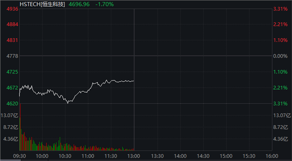 A股、港股方面,沪指、深证成指一度跌超1%,截至午间收盘,沪指翻红、深证成指跌幅收窄至0.12%;恒生指数盘中一度跌超2%,恒生科技指数一度跌超3%,目前跌幅分别收窄至1%及2%以内。