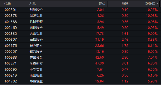有色金属板块领涨,板块盘中涨幅达1.8%,其中多只铝业股大涨,利源股份涨超10%,闽发铝业、怡球资源、常铝股份等涨停。