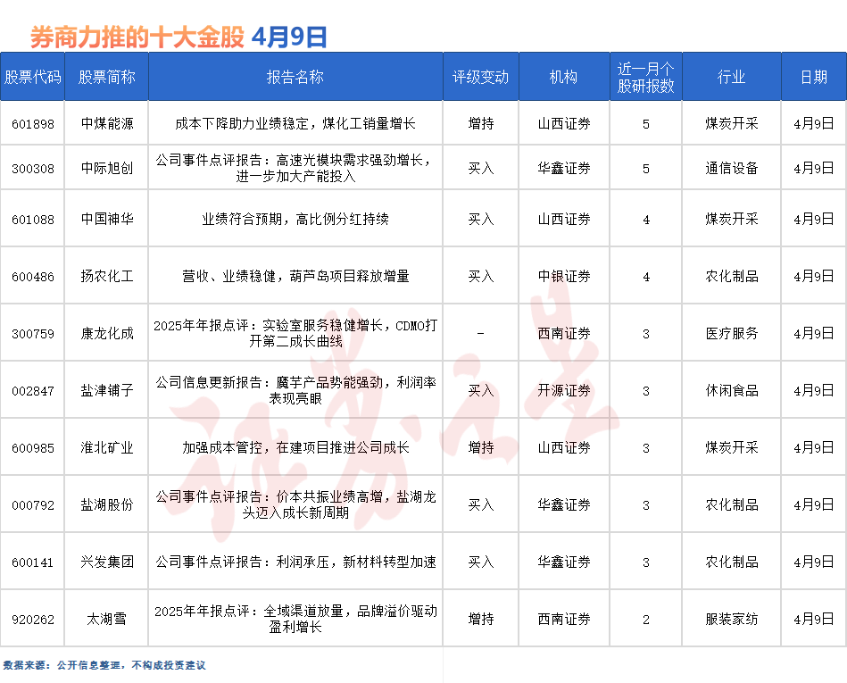 中煤能源最受券商关注,近一个月获国信证券、华源证券、信达证券、开源证券等5份券商研报关注,位居4月9日券商力推股榜首。