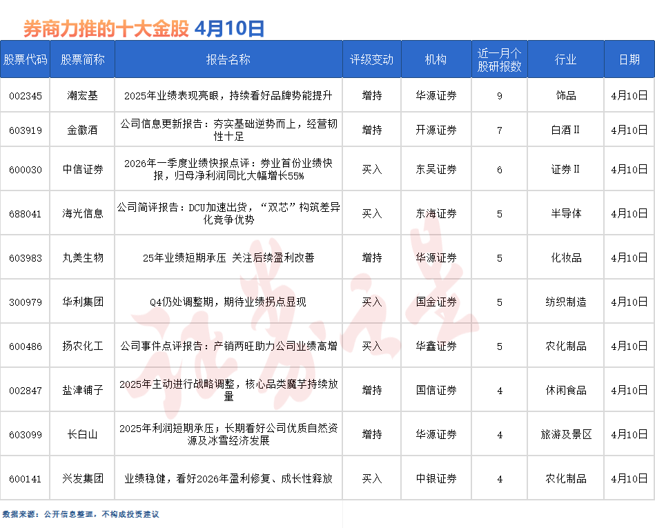 潮宏基最受券商关注,近一个月获中邮证券、山西证券、万联证券、国元证券、海通国际、东吴证券等9份券商研报关注,位居4月10日券商力推股榜首。