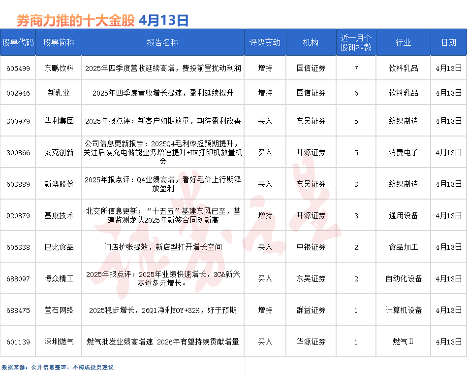 东鹏饮料最受券商关注,近一个月获中邮证券、万联证券、开源证券、华源证券、东吴证券等7份券商研报关注,位居4月13日券商力推股榜首。