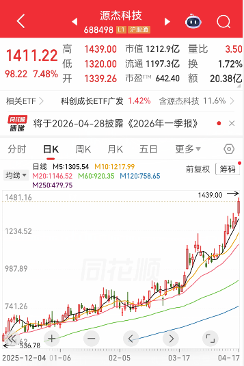 4月17日早盘,源杰科技(688498)盘中一度涨超9%,创下历史新高。截至上午9:55,公司股价达到1433元/股左右,同时超越贵州茅台,成为A股第一高价股,由此登上新“股王”宝座。