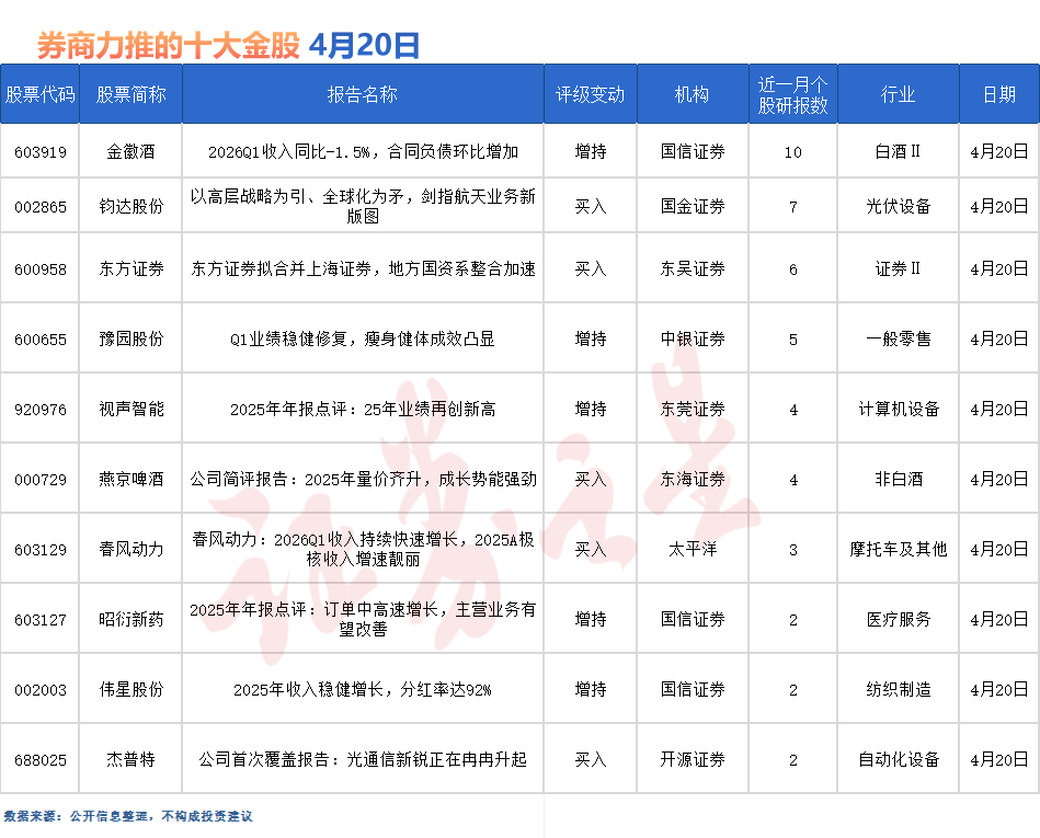 金徽酒最受券商关注,近一个月获东吴证券、国金证券、开源证券、华鑫证券、国信证券、东吴证券、西南证券等10份券商研报关注,位居4月20日券商力推股榜首。