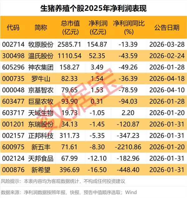 截至4月20日,12只生猪养殖股均已发布2025年业绩相关报告。从净利润规模看,牧原股份、温氏股份、神农集团、罗牛山、京基智农超过1亿元,依次为154.87亿元、52.35亿元、3.49亿元、1.54亿元、1.53亿元。