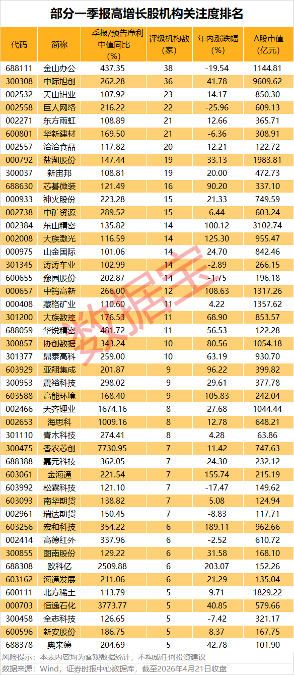 据证券时报·数据宝统计,按照一季报、一季报预告净利中值计算,有45只个股今年一季度净利同比增长超100%且有5家以上机构评级。