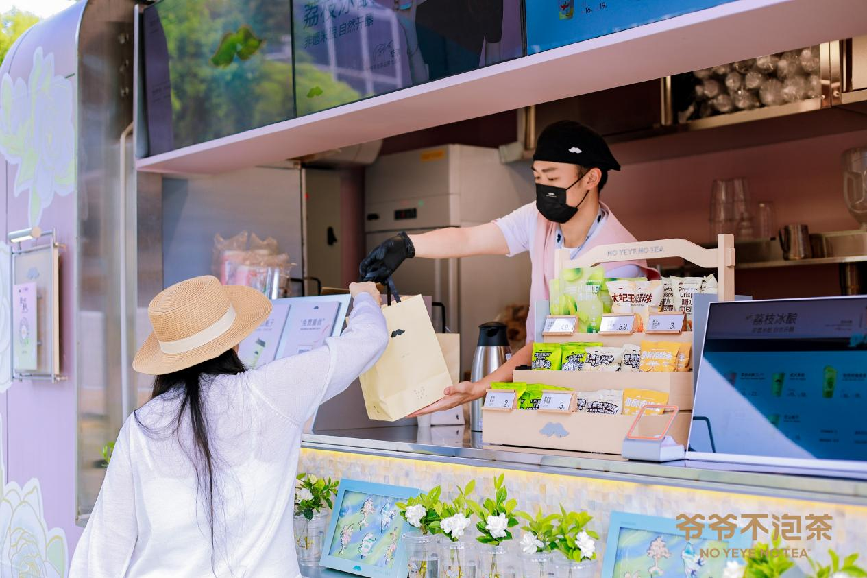 从晨光熹微到落日余晖,爷爷不泡茶餐车前人流不断。有人专程来领一束栀子花,有人在花下茶车前定格美好,有人携家人好友、带着爱宠小坐片刻,在花香与茶香里慢享春光。爷爷不泡茶以花为媒、以茶为伴,把城市的浪漫与烟火气揉在一起。